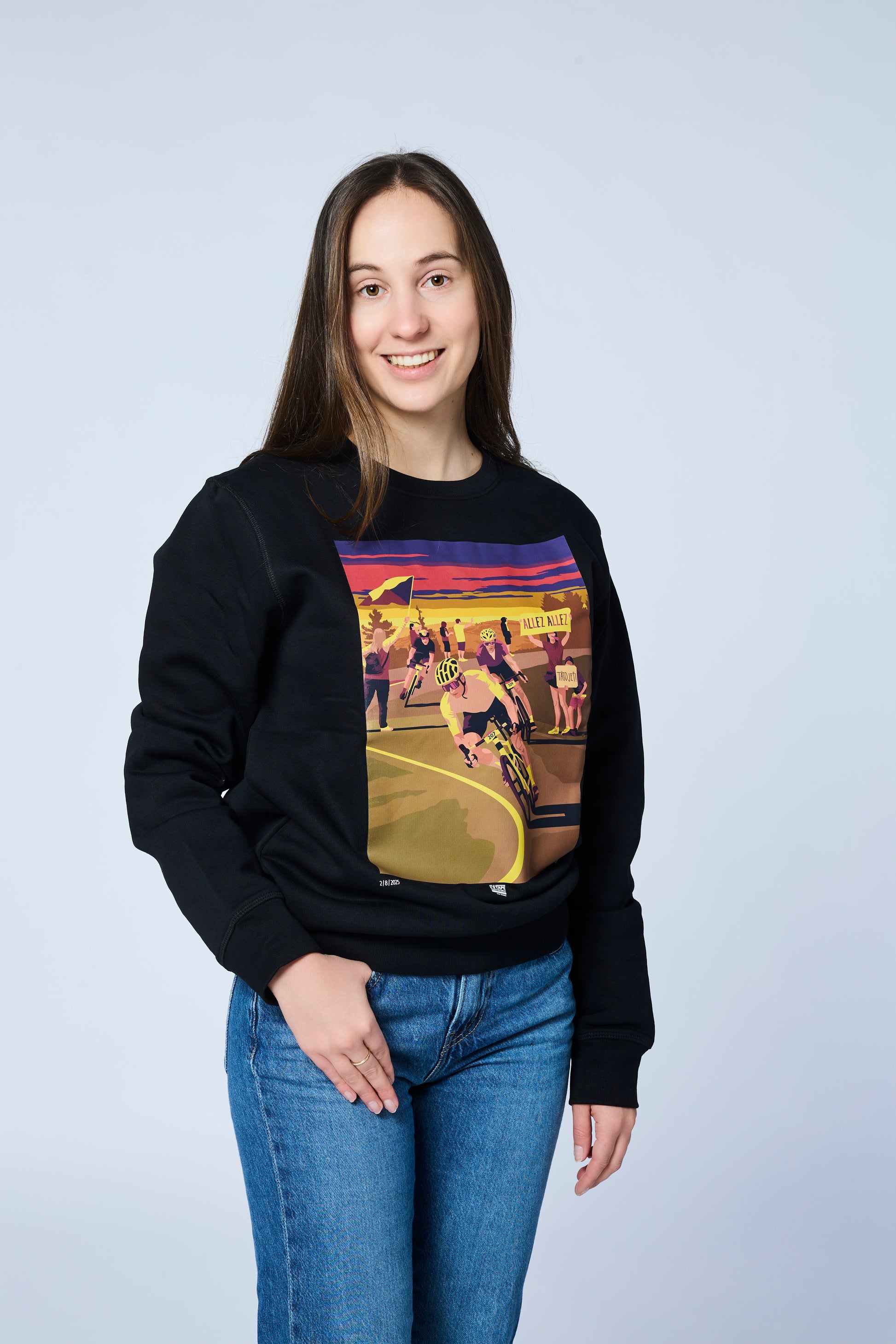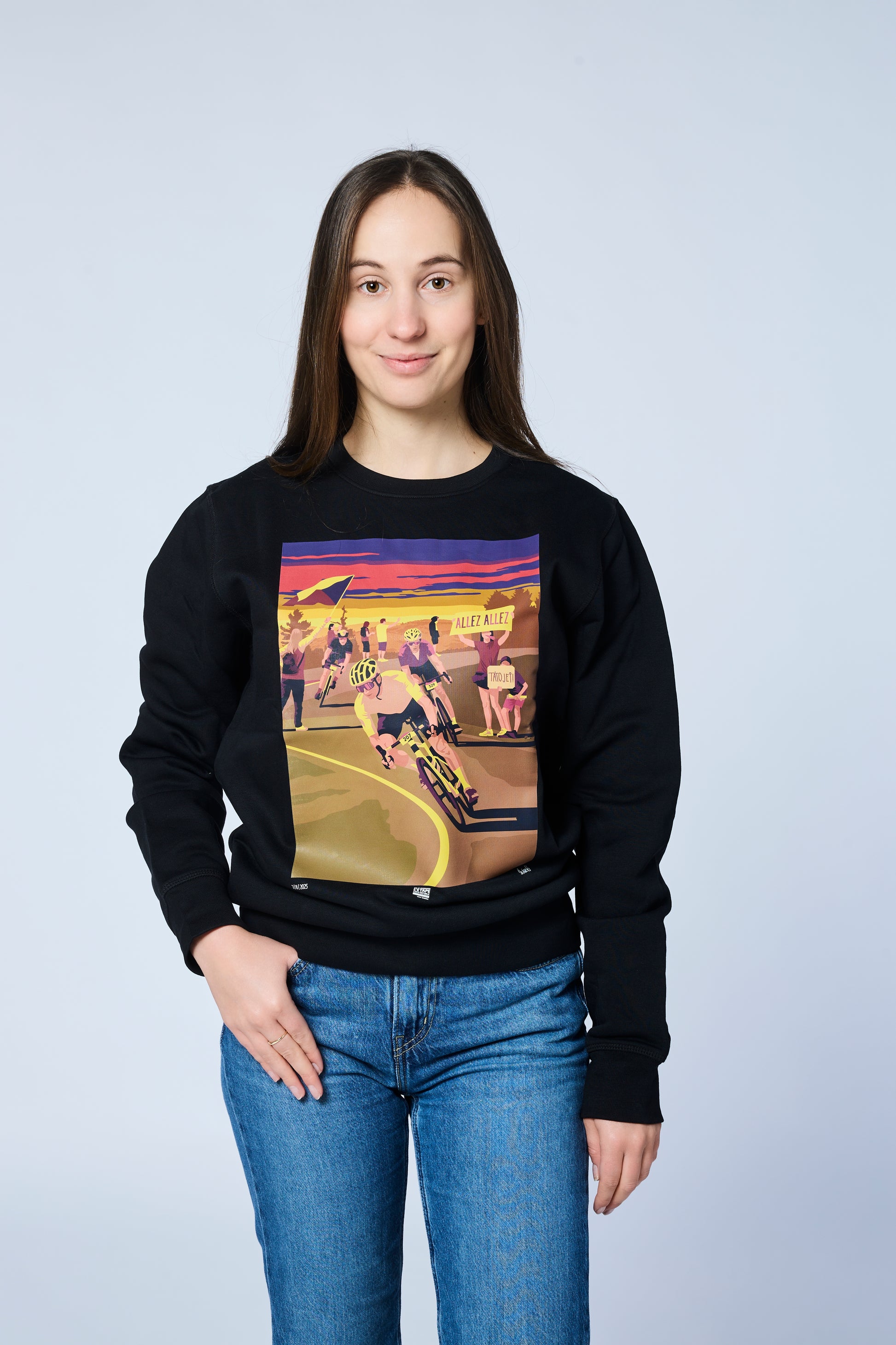 Bavlněná černá mikina s s exkluzivní grafikou od vizuálního umělce Jana Šrámka, na které nechybí závodníci, fanoušci, kvalitní asfalt ani vrstvící se šumavské horizonty.