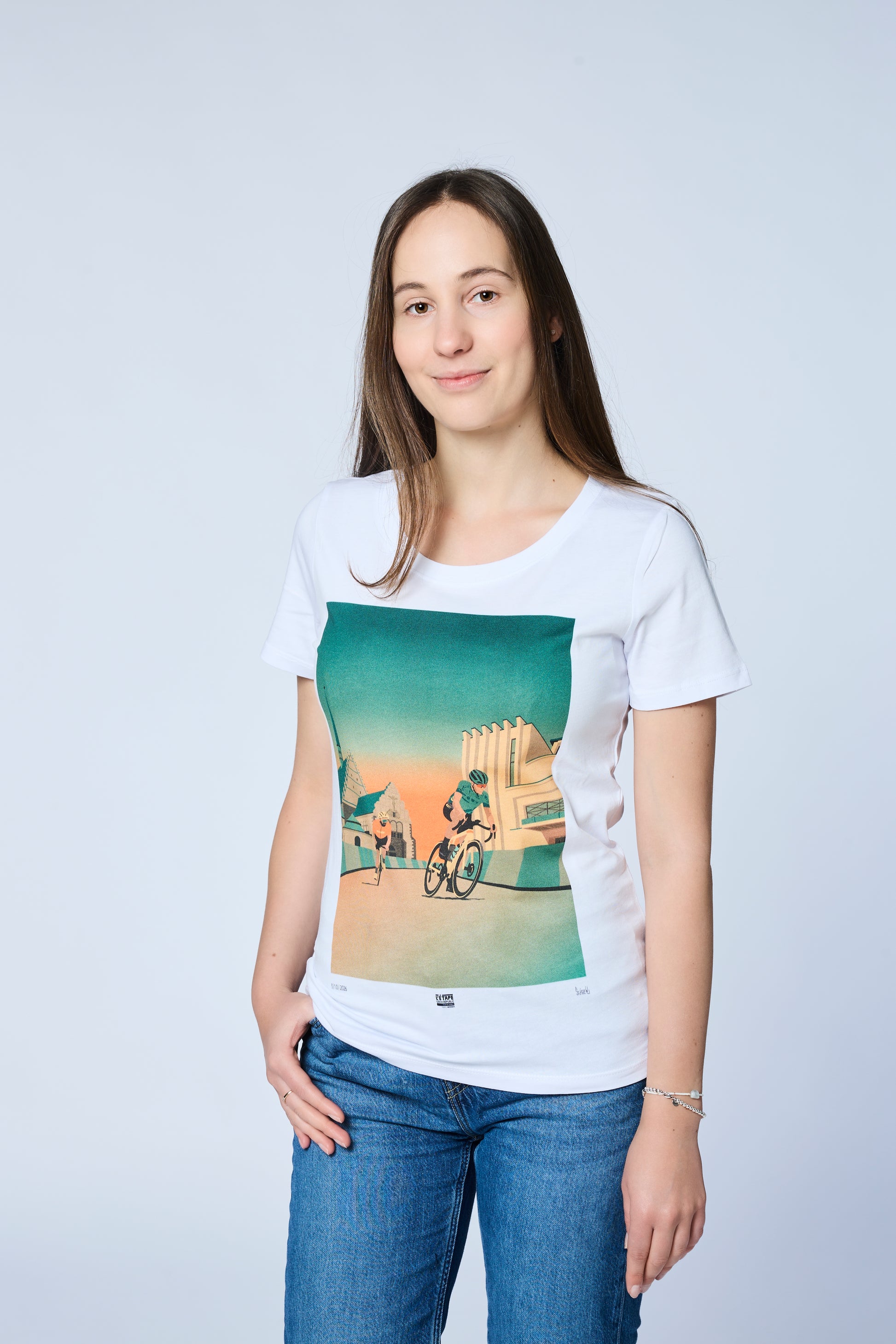 Kvalitní dámské triko s exkluzivní grafikou od vizuálního umělce grafika a ilustrátora Jana Šrámka, na které nechybí závodníci, Dům hudby a kostel svatého Bartoloměje v Pardubicích.