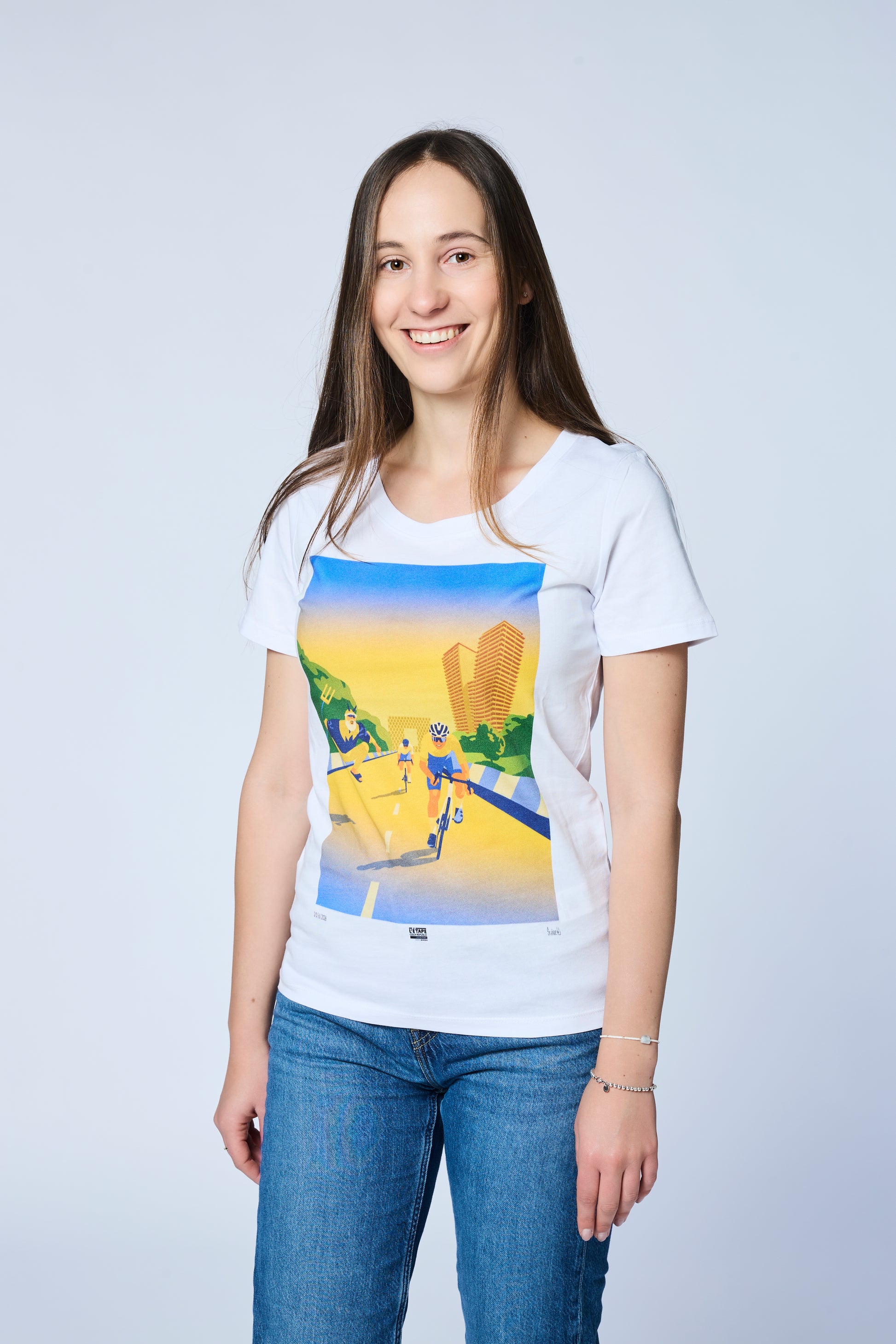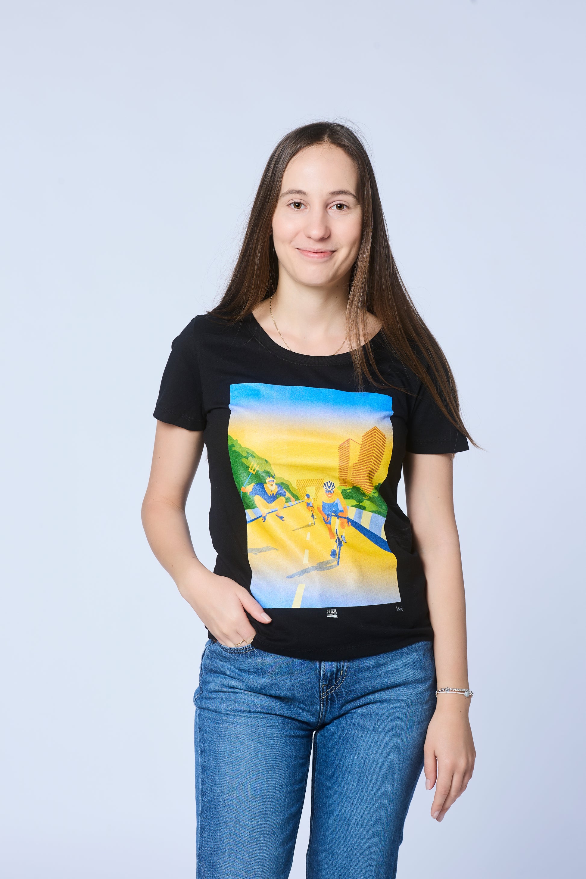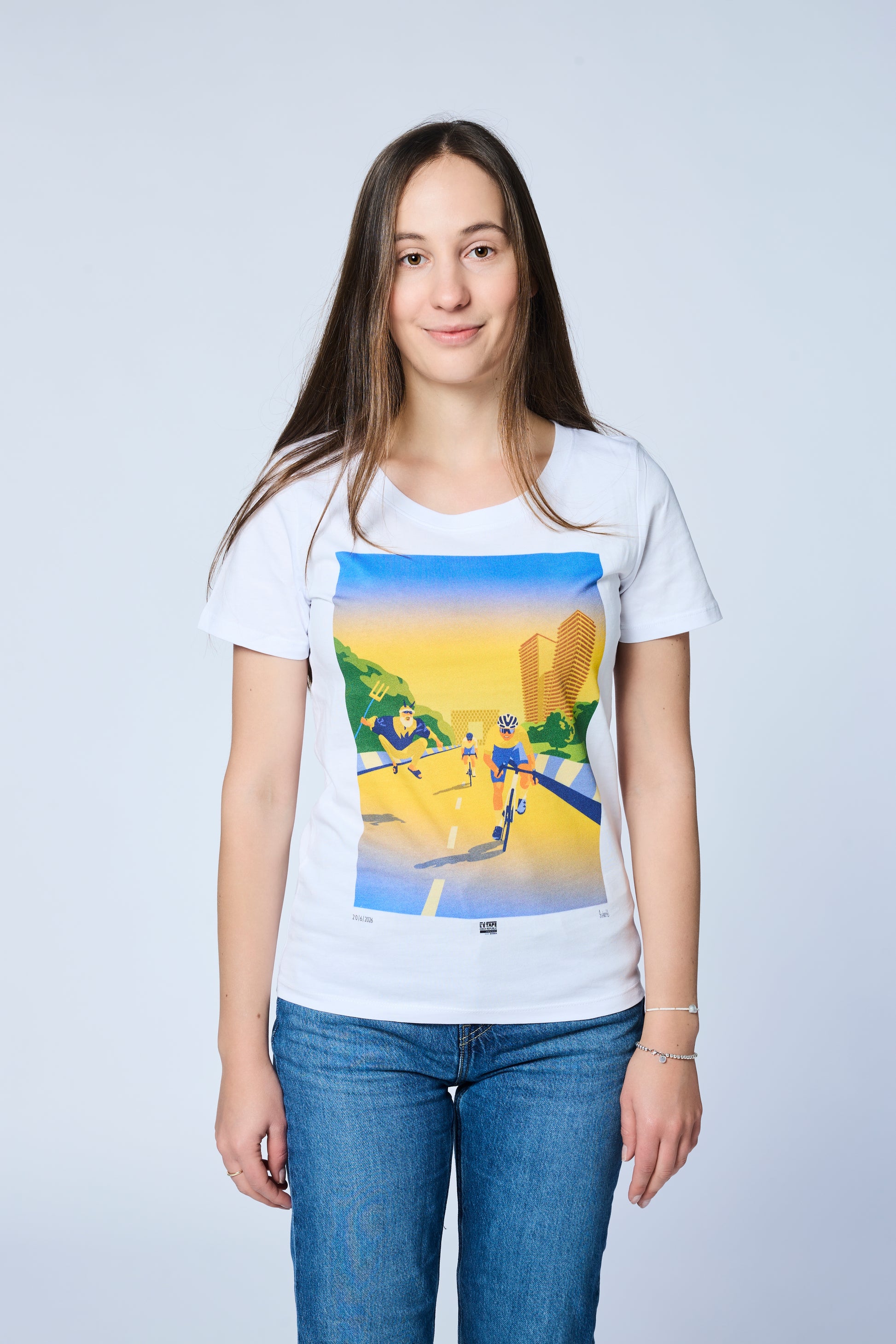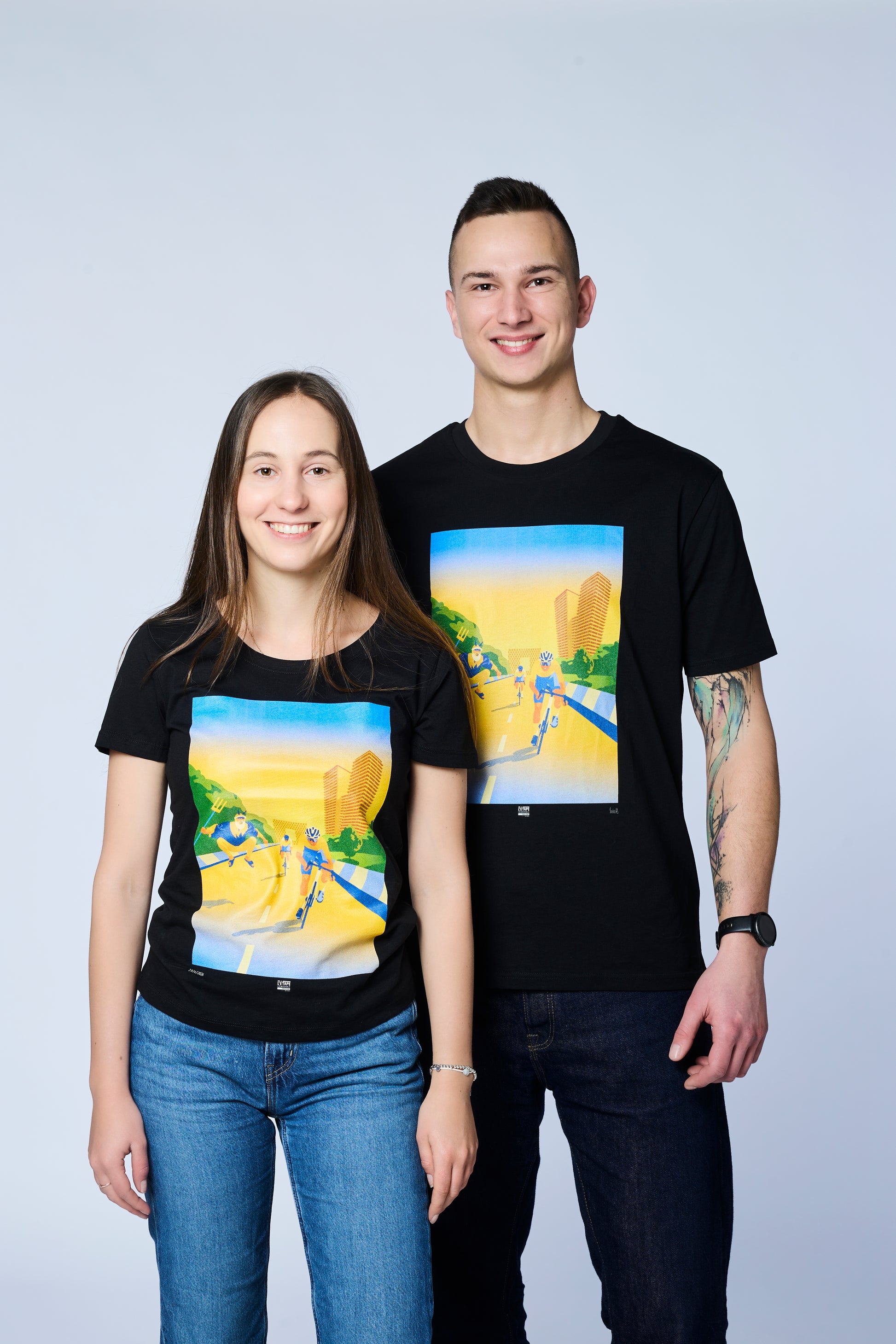 Kvalitní dámské triko s exkluzivní grafikou od vizuálního umělce grafika a ilustrátora Jana Šrámka, na které nechybí závodníci, Dům hudby a kostel svatého Bartoloměje v Pardubicích.